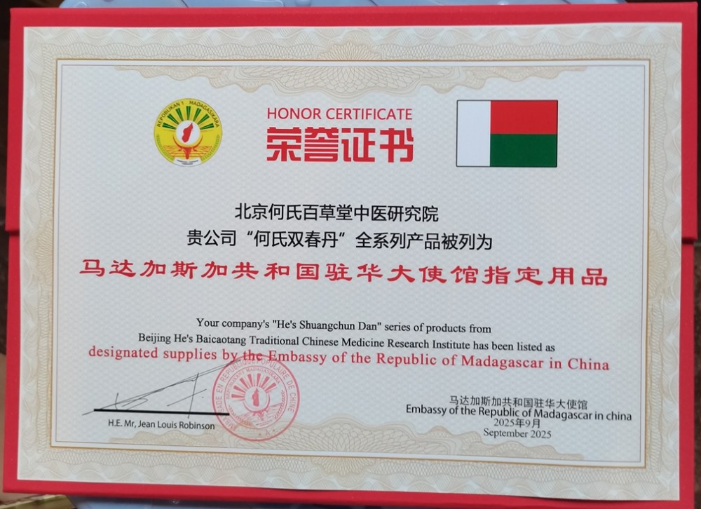 在重要的颁证仪式上,马达加斯加大使让·路易·罗班松与他做了深度交流,对他高度认可与评价。并亲自为他颁发荣誉证书,以表彰其在中医文化传播与实践领域的贡献,同时北京何氏百草堂中医研究院研制的“何氏双春丹”全系列产品被正式授予“马达加斯加大使馆指定用品”称号。双方合影留念,见证中马中医文化合作的重要成果。会中,何波院长分享了自己的医疗特色与从医心得,以实际行动践行了铭记、传承和发扬中华中医传统文化的优势与使命。