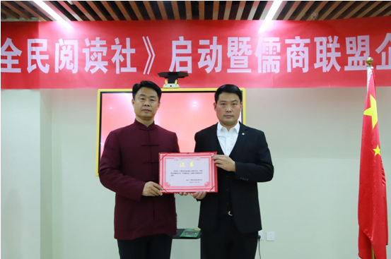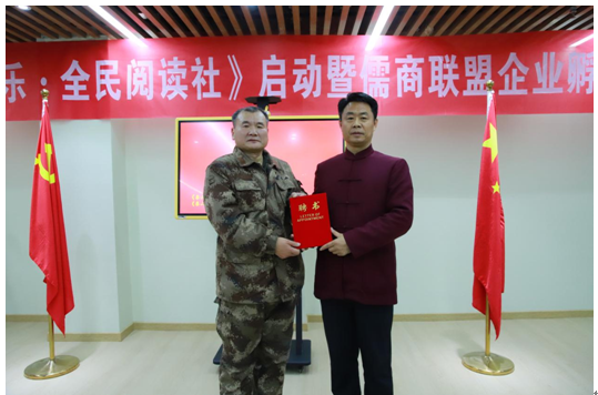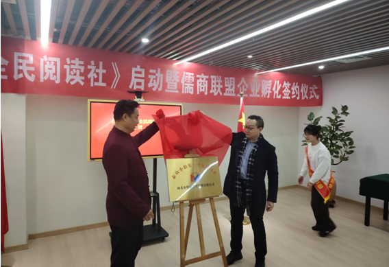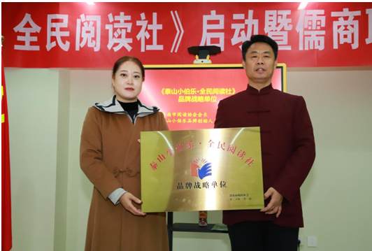 济南市统计局招商引资项目人赵玉栋(右)与山东小伯乐文化传媒有限公司董事长、泰山小伯乐品牌创始人刘建共同为《泰山小伯乐·全民阅读社》揭牌并讲话