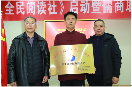 山东外事职业大学高级顾问、文史专家魏伯河教授(左)与山东交通学院教授、硕士研究生导师、山东省大众创新创业研究院副院长钟兵教授(右)为山东小伯乐文化传媒有限公司董事长、泰山小伯乐品牌创始人刘建颁发《泰山小伯乐·全民阅读社》大学生就业创业服务站牌匾