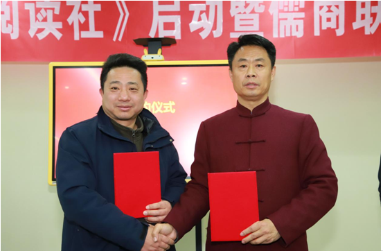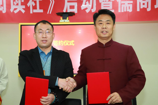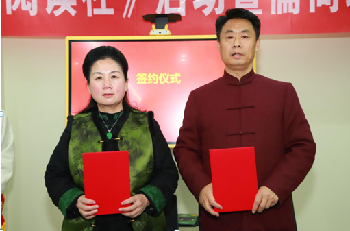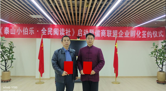 山东小伯乐文化传媒有限公司董事长、泰山小伯乐品牌创始人刘建与山东冠山书院文化创意有限公司魏素梅董事长签约战略合作仪式